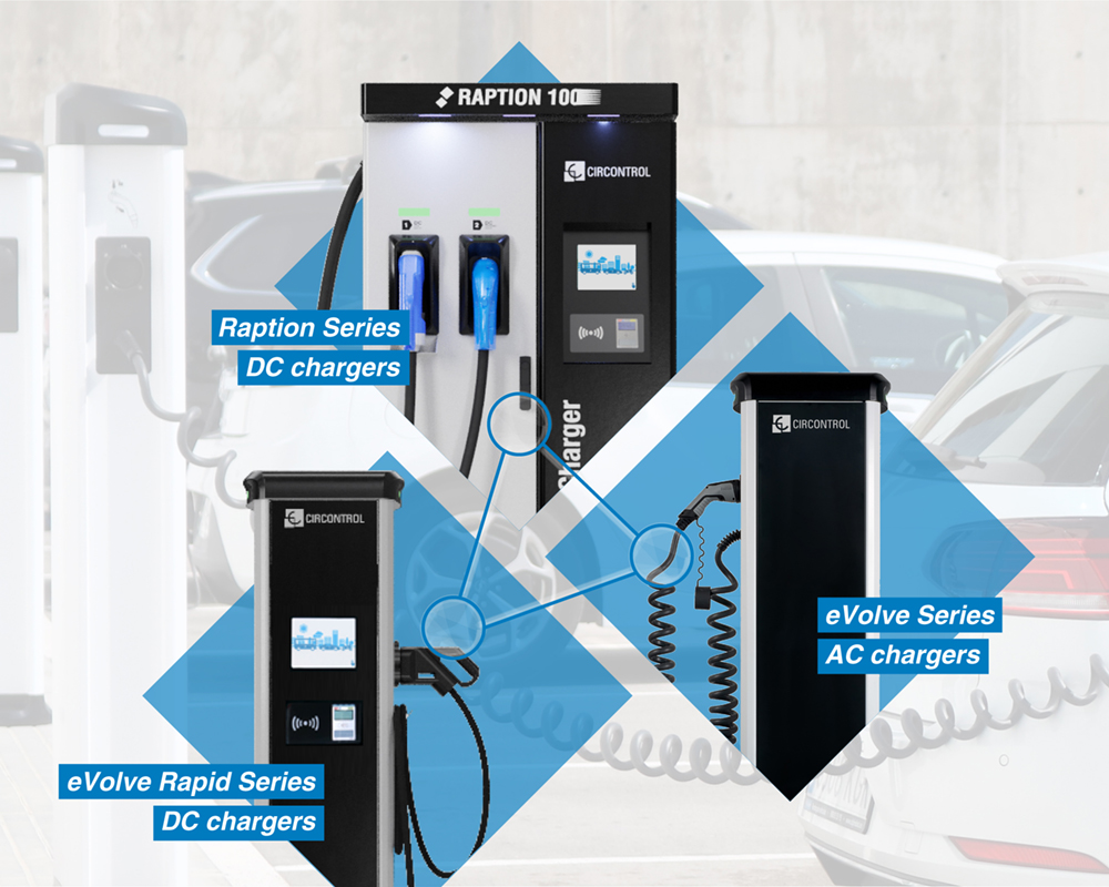 Existing Evolve Smart AC Stations can be incorporated as slaves into a Rapid DC charging cluster. Any Circontrol Raption DC charging station of 50 kW or more can operate as a master station to Rapid DC charging station slaves. Charging sessions on the slave stations are activated from the screen on the Raption master.